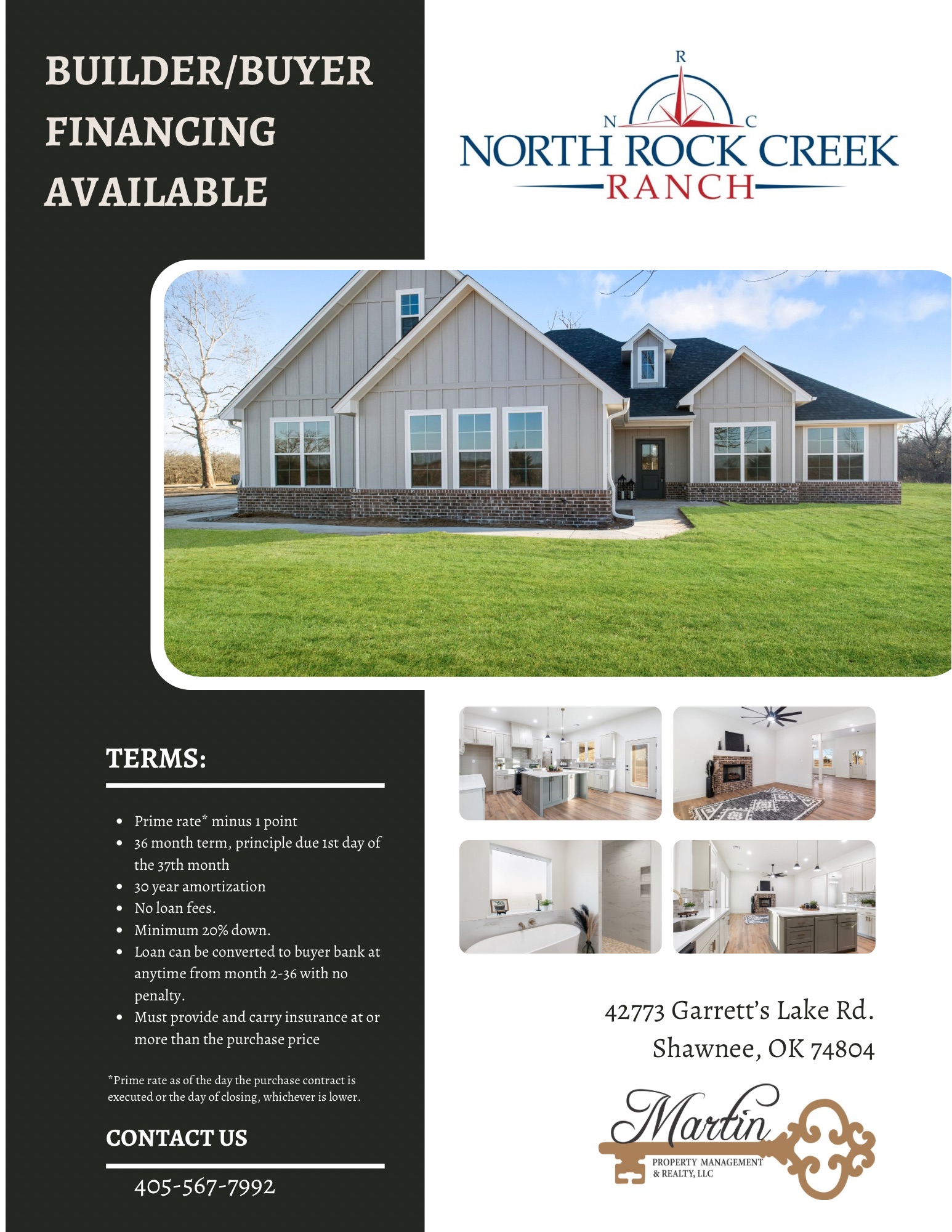 Welcome to North Rock Creek Ranch, Shawnee's newest addition in the highly sought-after North Rock Creek School District. This gorgeous home with immaculate finishes was built by Lilley Signature Homes. As your eyes sweep from the rich wood flooring up to the stately vaulted ceilings, they will take in the warm tones of carefully curated paint colors and hardware. Imagine yourself cooking and entertaining in the large open-concept kitchen area, which features ample amounts of custom cabinetry. Rest easily in the primary suite with tray ceilings and pamper yourself in the ensuite bathroom with a soaking tub and gleaming shower. A spacious walk-in closet caps off the suite. A mud closet and oversized laundry room provide extra storage and an abundant workspace. The three-car garage will provide all the extra room required for the big toys you need and want. A second-floor bonus room allows you to customize the space to suit your needs. Utilities include City of Shawnee water, CVEC electric and fiber, and ONG gas. This addition has a great central Oklahoma location, only minutes from I-40 and Shawnee, down 3/4 of a mile of paved road off of Hwy 18, and just across the street from NRC Schools. These homes are part of the largest home development in the NRC school district. Of the 97.5 total acres in the development, 47 acres will be retained for equestrian trails and facilities. Once the development is complete, this picturesque home will be nestled in beautiful timber and will feature equestrian amenities including a large stable, round pen, and trails.